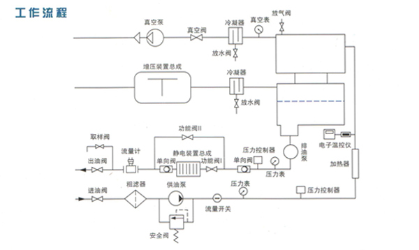 油液在供油泵的作用下由進油口進入粗濾器,通過粗濾器除去油中較大雜質(zhì)后經(jīng)過加熱器時被加熱到55℃左右,加熱后的油液首先通過初級真空罐內(nèi)的脫氣元件噴射到真空罐內(nèi),在真空狀態(tài)下,水份會低溫沸騰而變成水蒸氣,然后被真空泵抽出,被抽出的水蒸氣在通過冷凝器時大部分被冷凝成水,小部分透過真空排氣口排出。