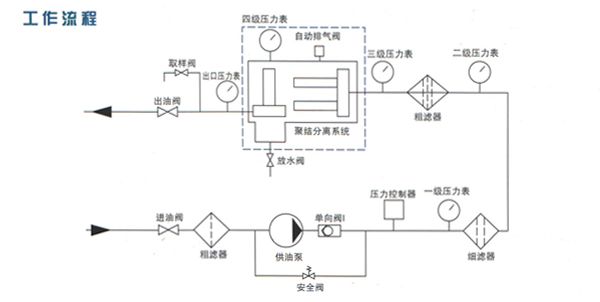 被過濾的油液在供油泵的負(fù)壓驅(qū)動下首先通過粗濾器,攔大于60μm雜質(zhì),然后進(jìn)入到細(xì)濾器,大于20μm的雜質(zhì)被過濾掉,當(dāng)油液經(jīng)過精濾器時(shí),過濾精度可達(dá)到3μm。油液經(jīng)過3次過濾后,進(jìn)入到聚結(jié)分離罐進(jìn)行脫水處理。油液在聚結(jié)分離罐內(nèi)首先通過聚結(jié)元件,聚結(jié)元件有破乳和聚結(jié)兩種功能,在通過破乳層時(shí)破掉乳化油的乳化度,使之形成游離態(tài)的油和水,在通過聚結(jié)層時(shí),小顆粒的水聚結(jié)形成大顆粒的水,由于油、水存在比重差,因此聚結(jié)后的大顆粒水自然沉降在聚結(jié)分離罐底部的蓄水池內(nèi)。未及時(shí)沉降下來的水繼續(xù)隨油液前行,在通過分離元件時(shí),由于分離元件表層噴涂有高分子材料,對水有強(qiáng)大的排斥作用,因此可把水?dāng)r于分離元件之外,使之不能通過分離元件,水自然沉降到蓄水池內(nèi),從分離元件流出的油就是凈油,這就完成了對油凈化的過程。